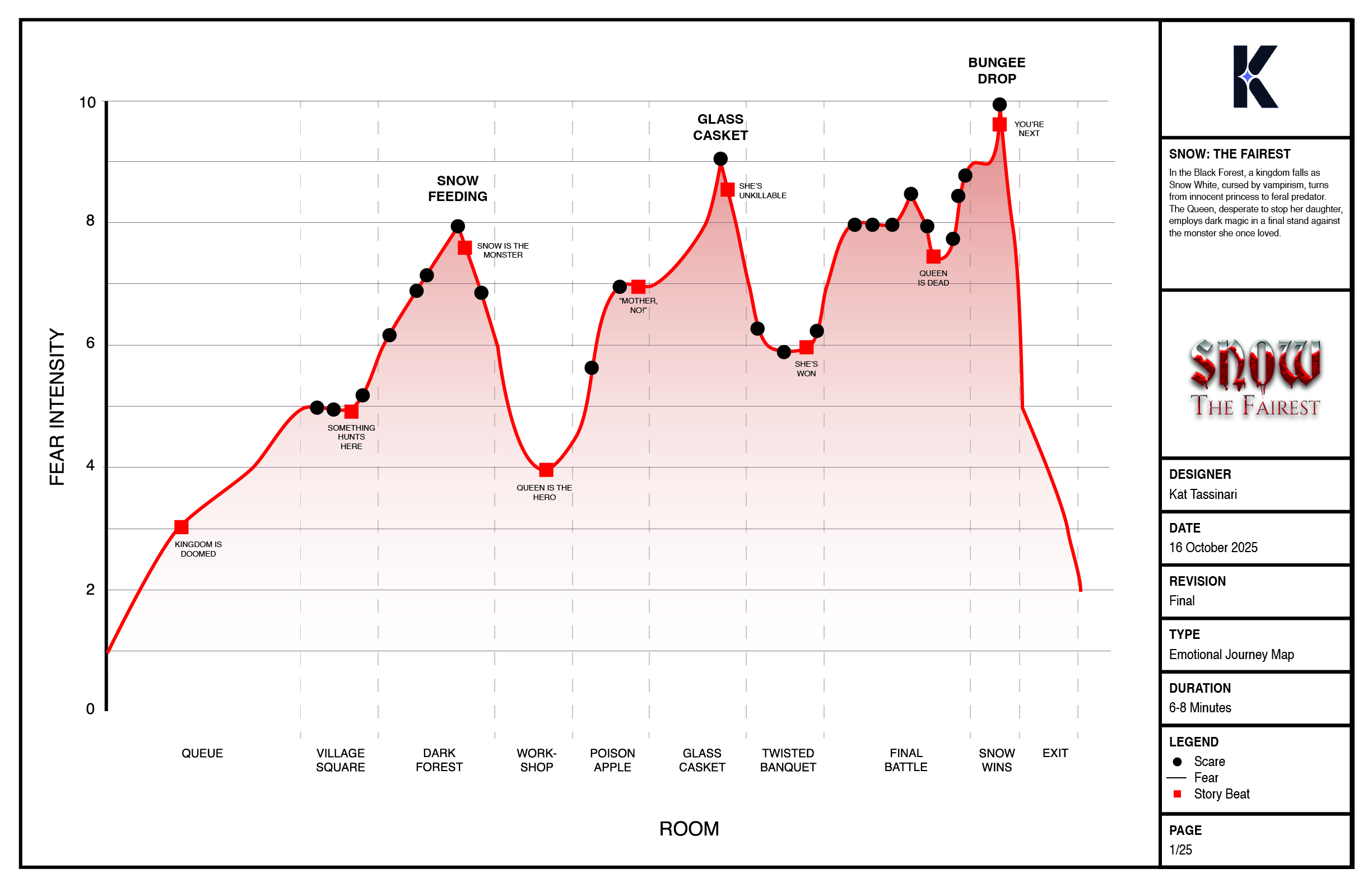 "Snow: The Fairest" subverts the classic fairy tale into a visceral horror experience for Universal Orlando's Halloween Horror Nights. In this twisted retelling, Snow White is a feral child vampire terrorizing a kingdom, while the Queen becomes the unlikely hero attempting to stop her reign of terror. This comprehensive design portfolio piece—presented to Disney Legend Bob Weis—demonstrates end-to-end attraction development from concept through operational specifications.