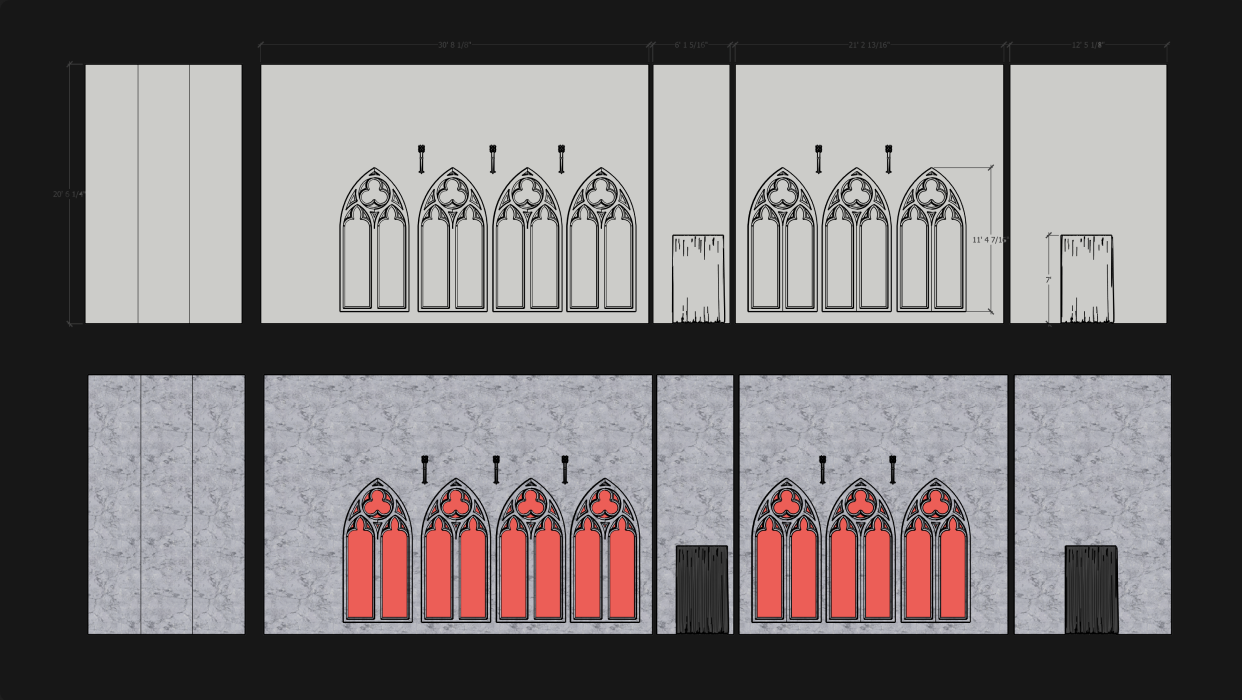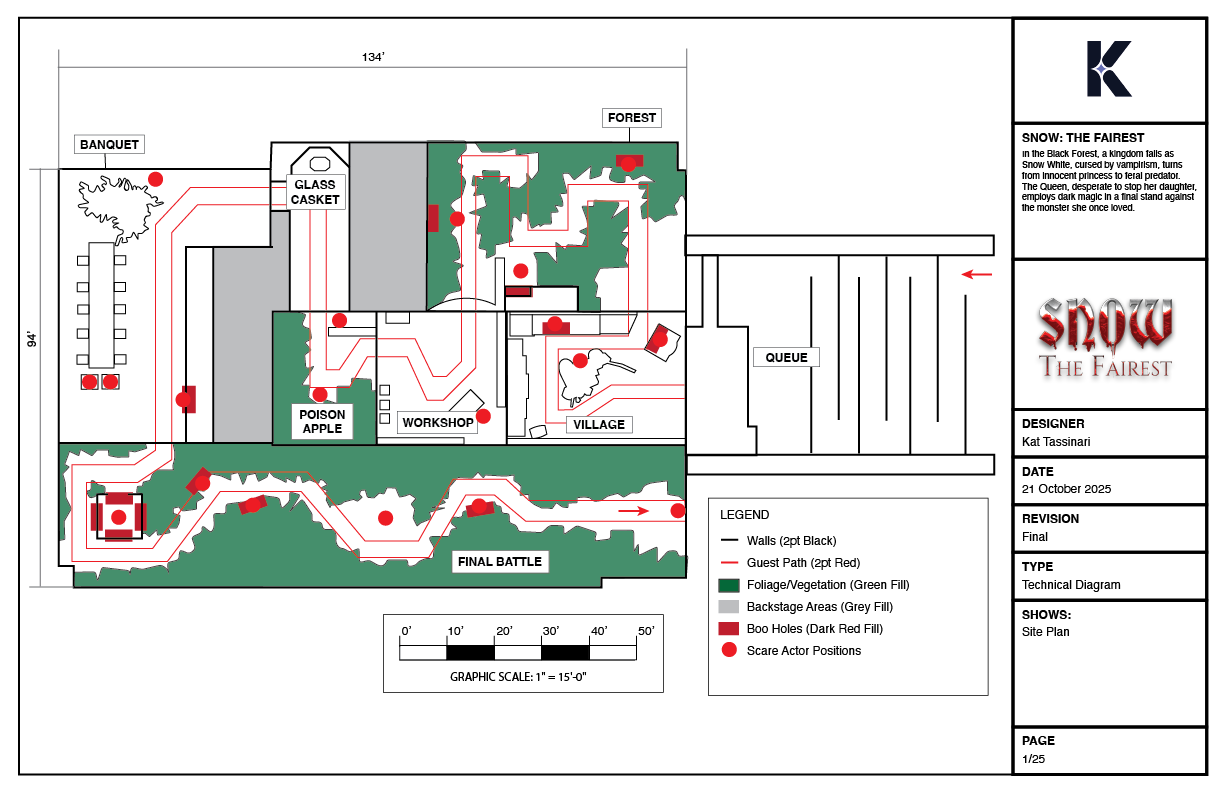 Every creative decision was validated against real-world operational requirements—the hallmark of professional themed entertainment design. Elevation drawings show how half-timbered village facades, gothic cathedral walls, and forest scenic elements fit within the 94' × 134' building envelope. Every prop, scare position, and sightline blocker is strategically placed to maintain show quality and operational flow.