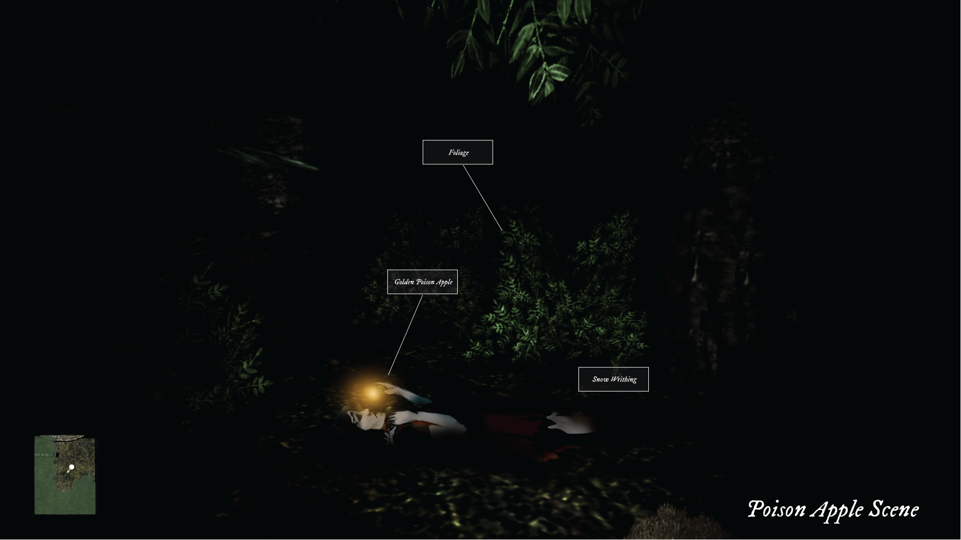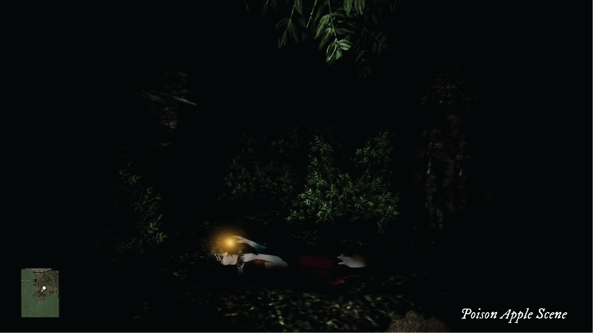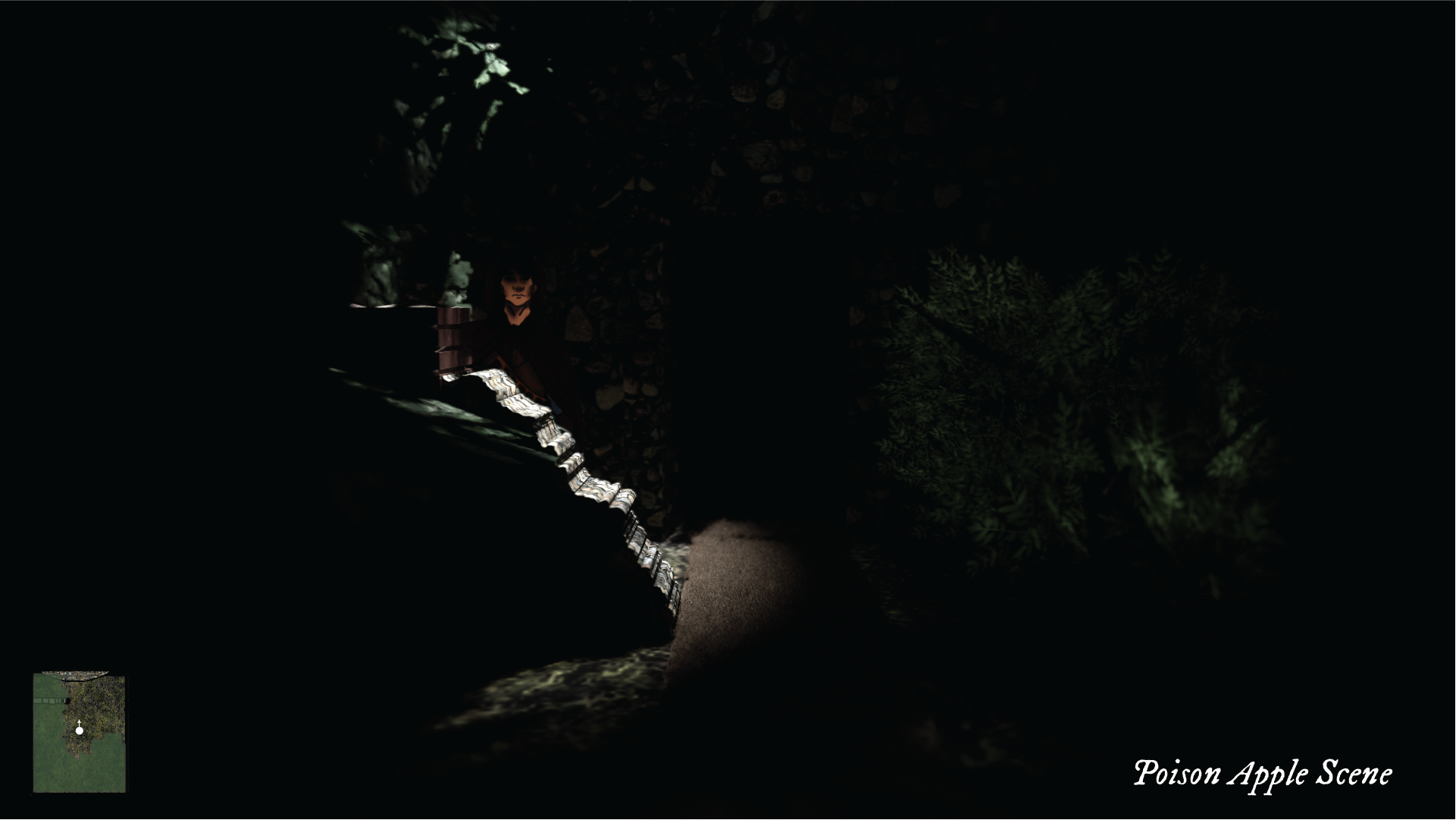 Stepping through the magic mirror, guests watch as Snow bites the cursed apple. Her body convulses—the sound of snapping bones fills the room, and they hear the monster, or perhaps the girl, cry out - "mother, no!". Shrouded in shadows, the huntsmen and the queen warn guests to run, for she will not stay down for long.