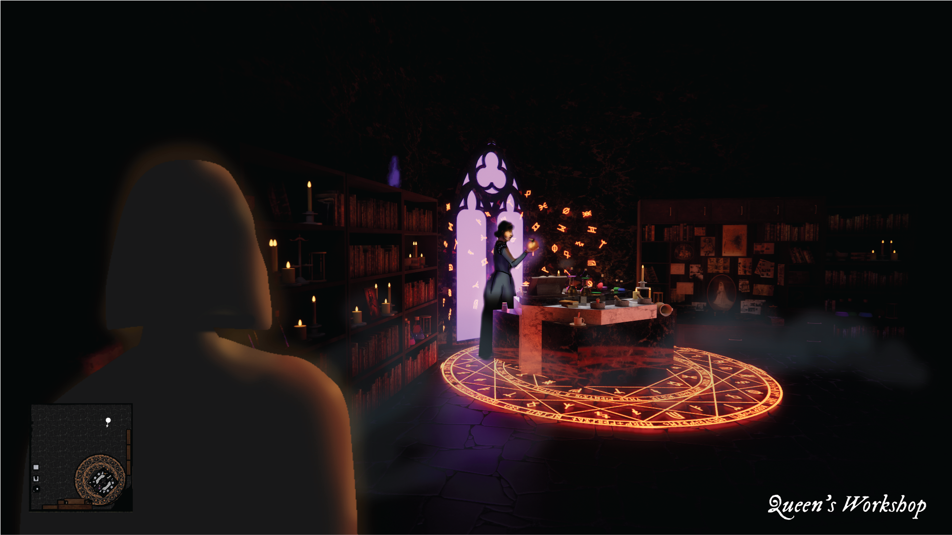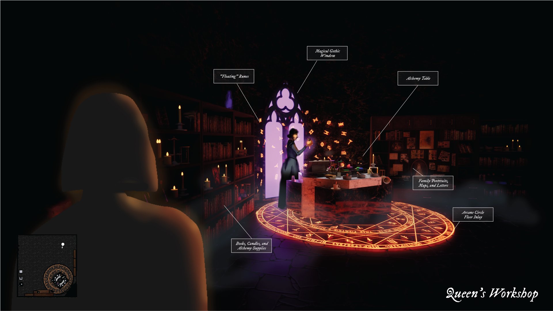 In the Queen's candlelit workshop, guests discover she's not the villain—she's the solution. Alchemy tables, magic mirrors, and spell circles reveal her desperate attempts to create a cure. Gothic windows bathe the scene in purple light as guests realize they've been rooting for the wrong character. She whispers feverishly, desperately, as her grief for her daughter becomes clear to guests passing by.