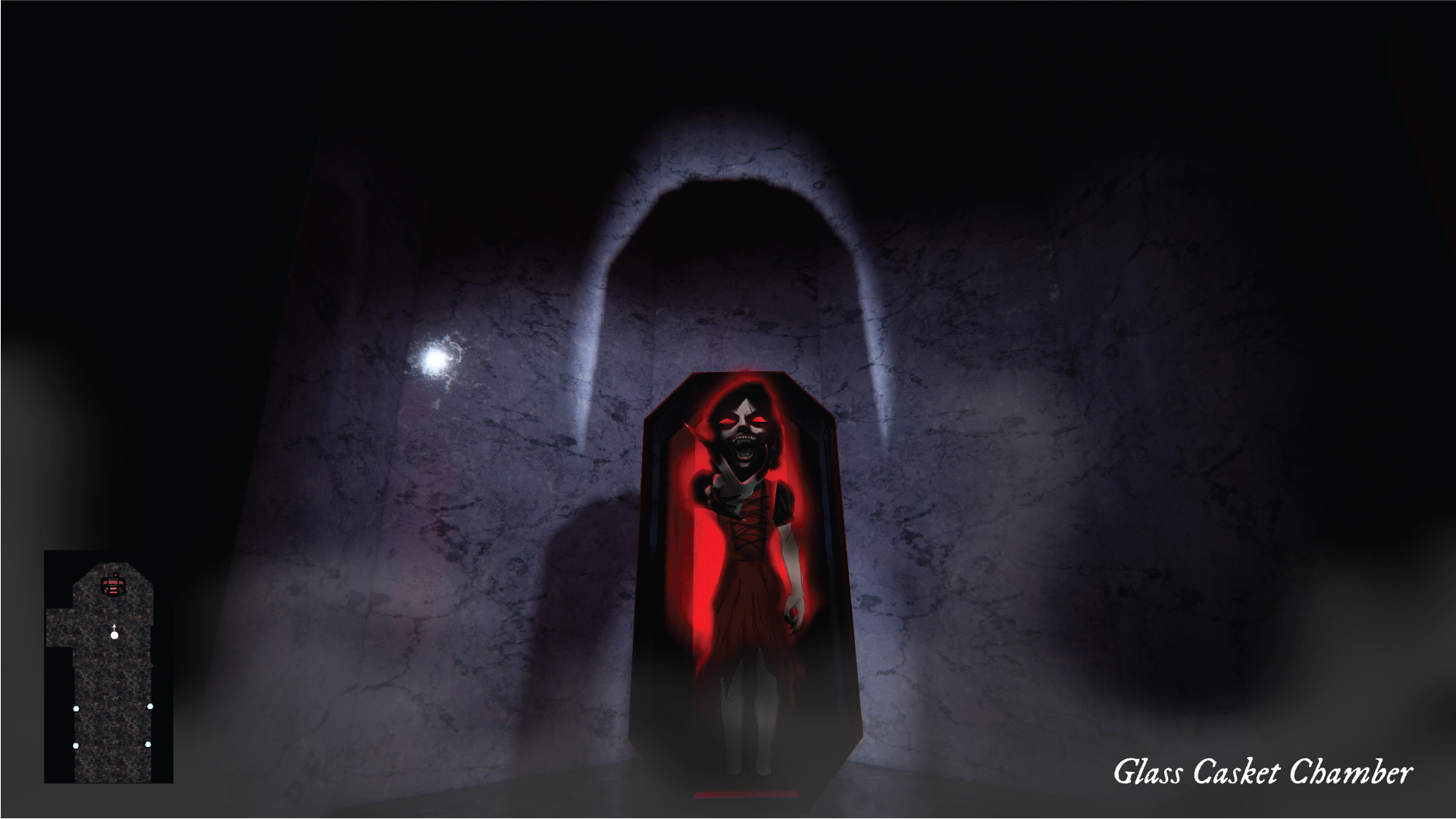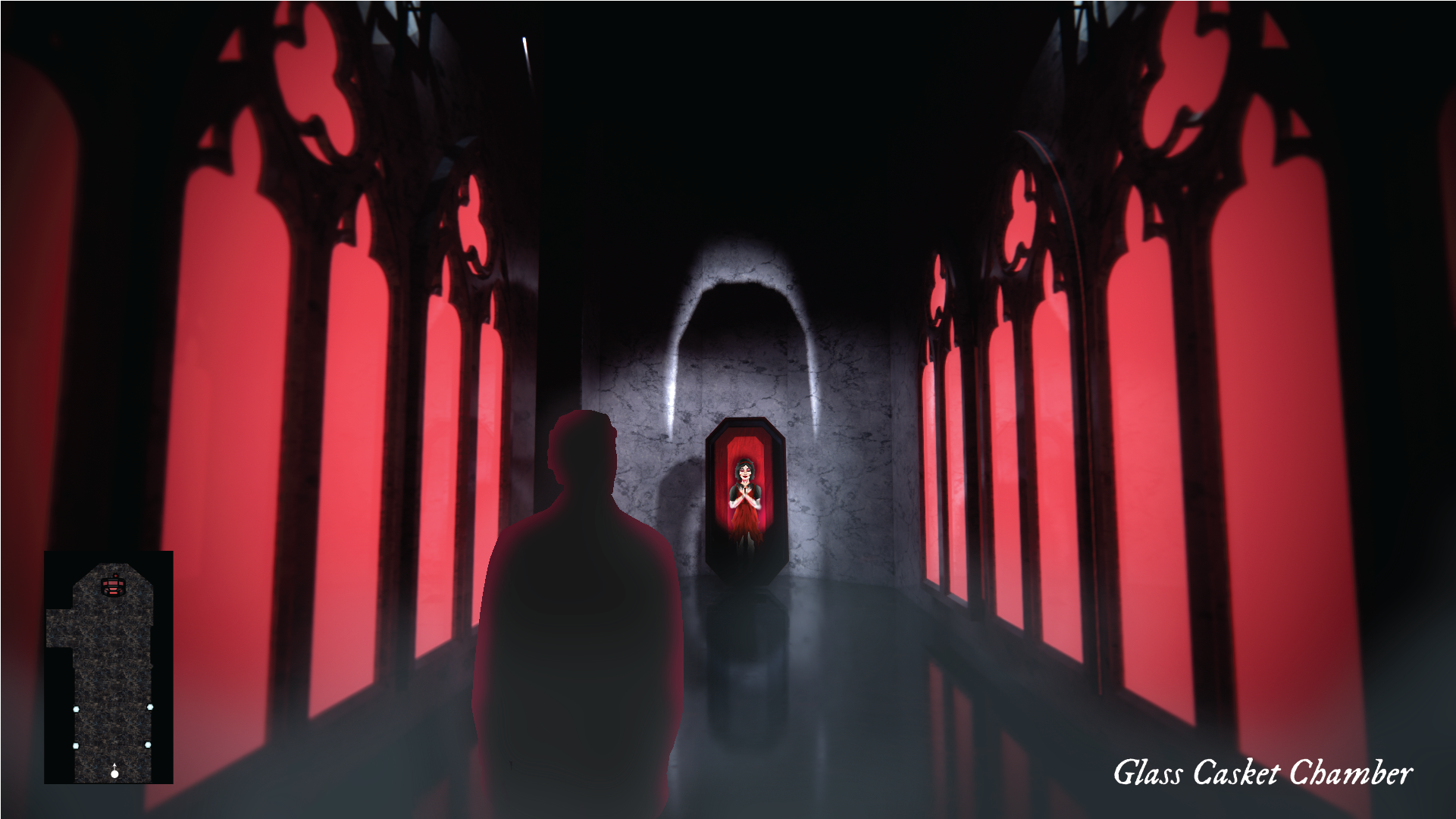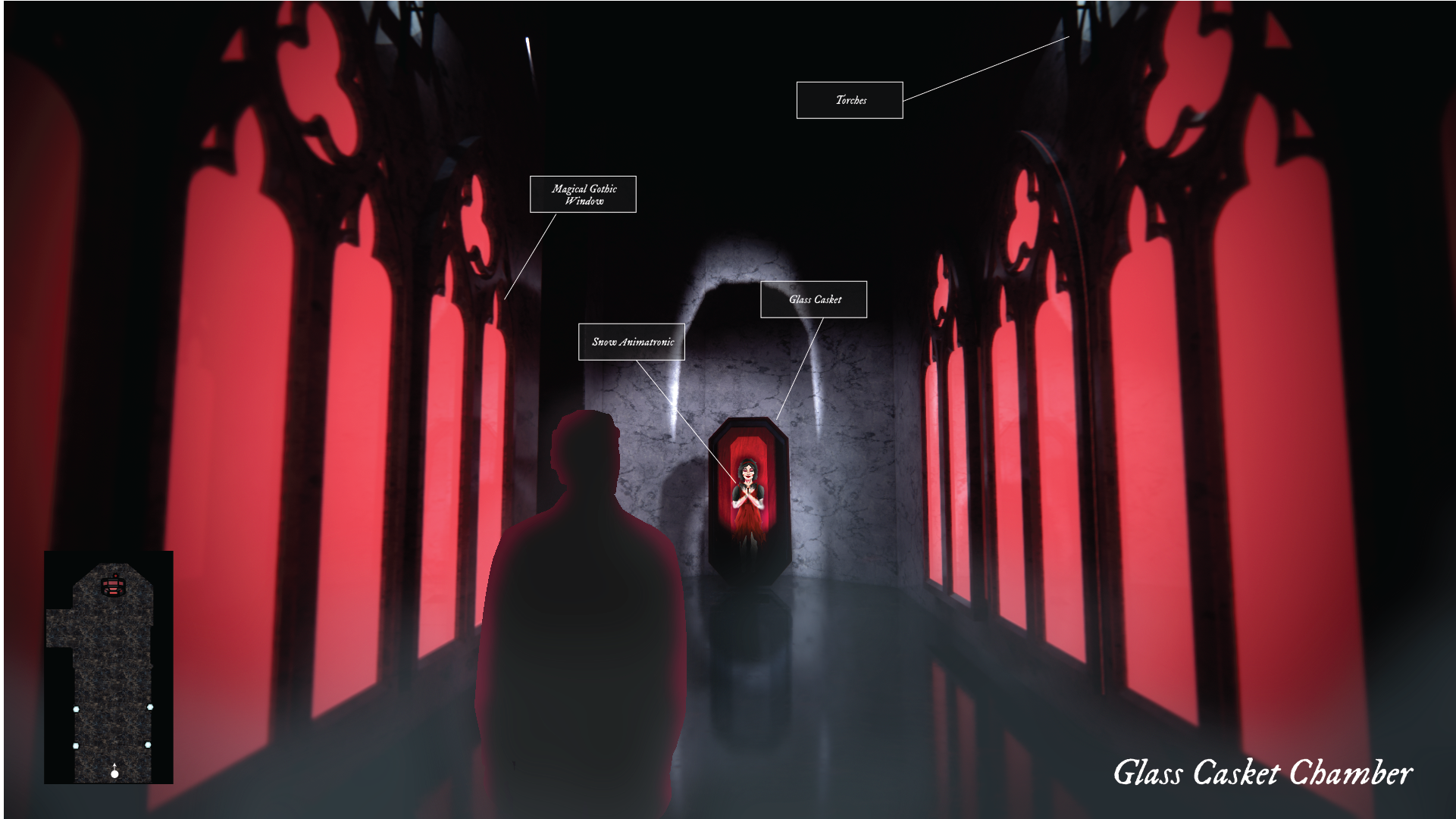 Guests enter a gothic chamber where Snow lies in her famous glass casket. Red-lit gothic windows line stone walls and guests are closed in, forced to inch closer and closer. The casket suddenly rattles—she's very much alive, and very hungry. She lunges at guests and shatters the coffin in a flurry of air, sound, water, lighting, and fog effects as they narrowly escape.